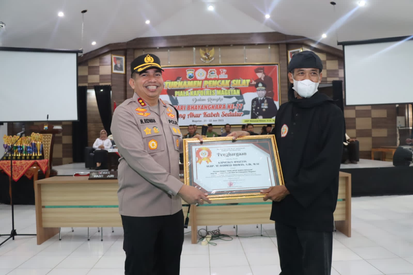 Piagam penghargaan diserahkan langsung oleh Ketua IPSI Magetan, Hari Siswanto Dalam turnamen Pencak Silat Kapolres Cup.3 di Aula Pesat Gatra, Polres Magetan, Jawa Timur, Kamis (22/6/2023).