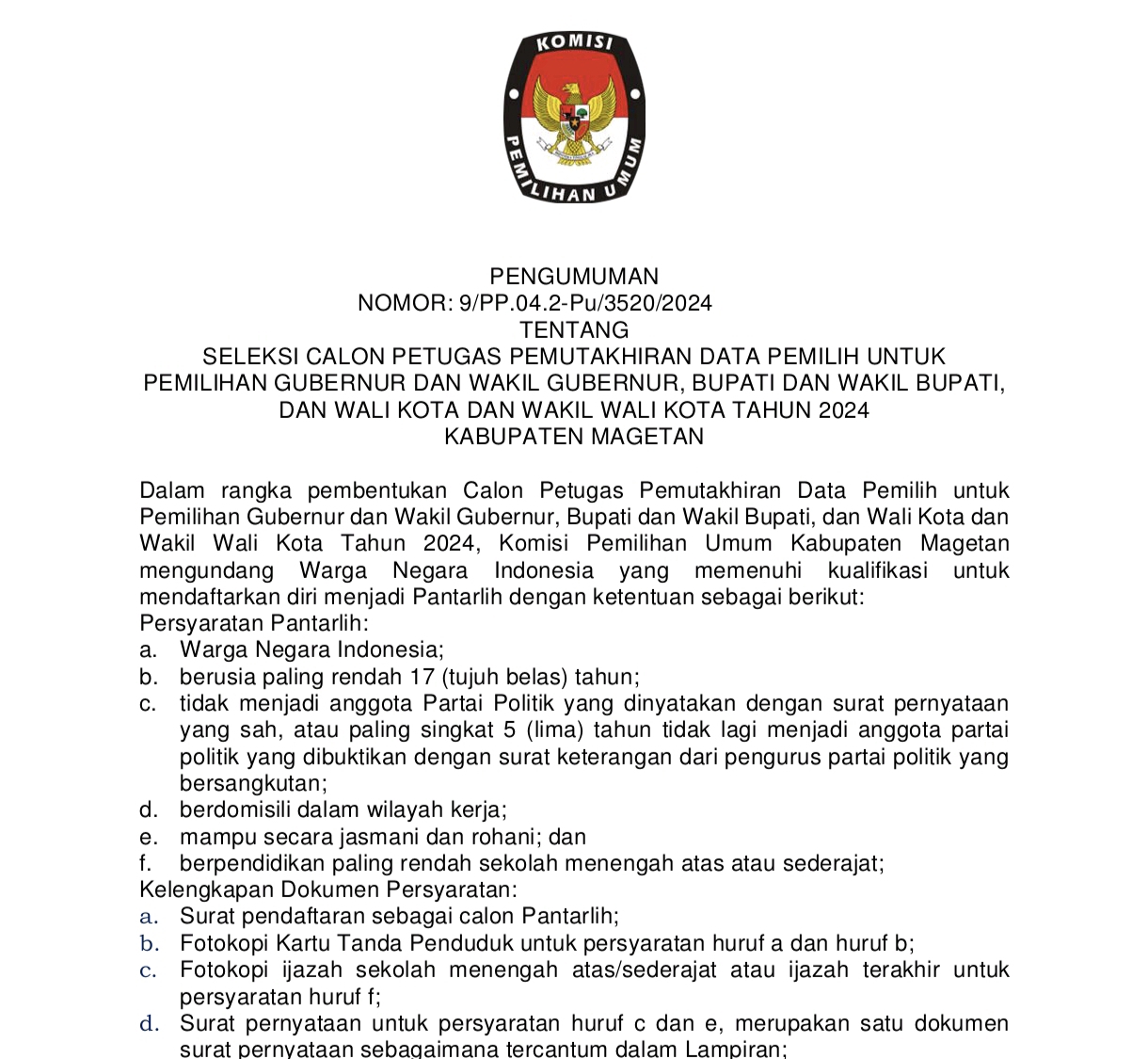 Surat pengumuman yang ditandatangani langsung oleh Ketua KPU Magetan, Noviano Suyide tersebut menjelaskan, dalam rangka pembentukan Calon Petugas Pemutakhiran Data Pemilih untuk Pemilihan Gubernur dan Wakil Gubernur, Bupati dan Wakil Bupati, dan Wali Kota dan Wakil Wali Kota Tahun 2024, Komisi Pemilihan Umum Kabupaten Magetan. mengundang Warga Negara Indonesia yang memenuhi kualifikasi untuk mendaftarkan diri menjadi Pantarlih dengan ketentuan sebagai berikut: